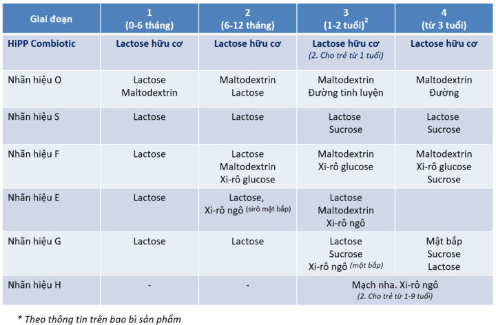Bảng dưới đây cho biết các loại đường trong các loại sữa công thức hiện có tại thị trường Việt Nam.